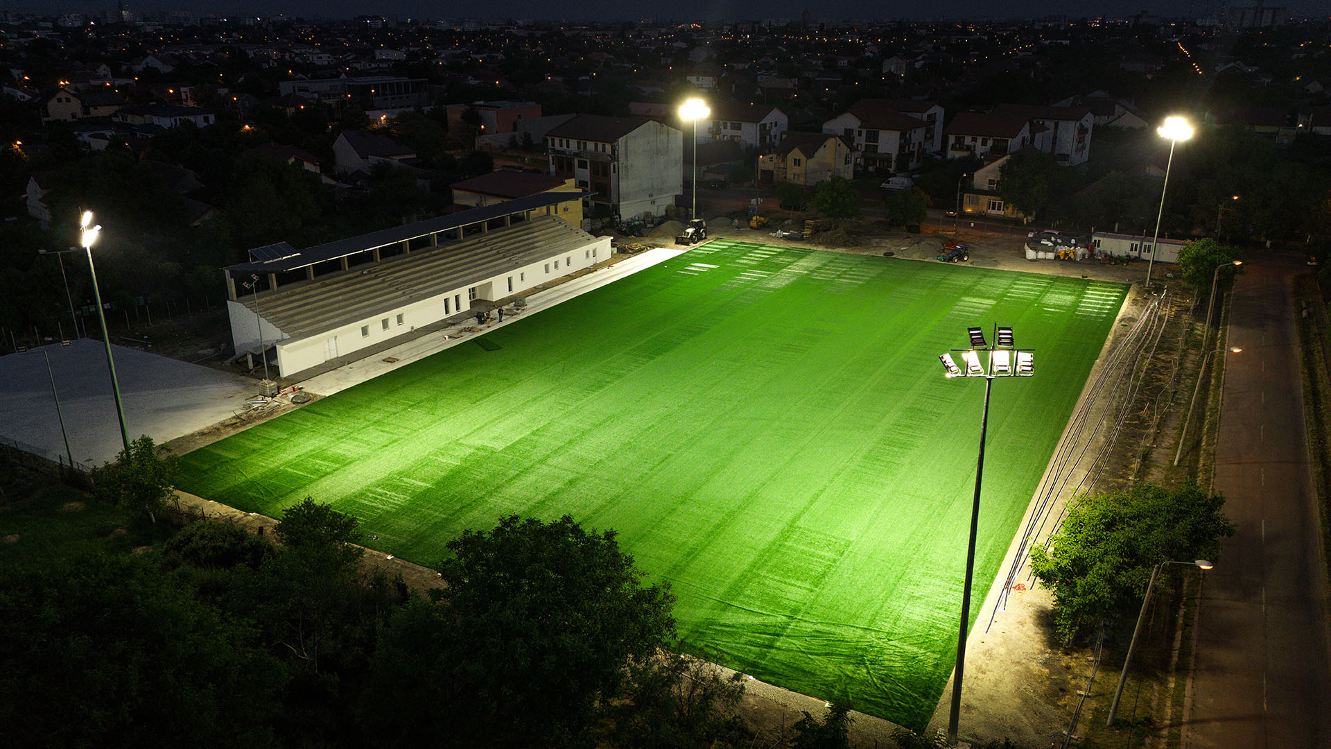 Lucrările au avansat vizibil: gazonul a fost montat, instalația de nocturnă este deja funcțională, iar în scurt timp vor fi trasate marcajele de joc. Pe lângă terenul principal, se lucrează și la finalizarea clădirii administrative, a fațadei, a vestiarelor și a tribunei cu 417 locuri.