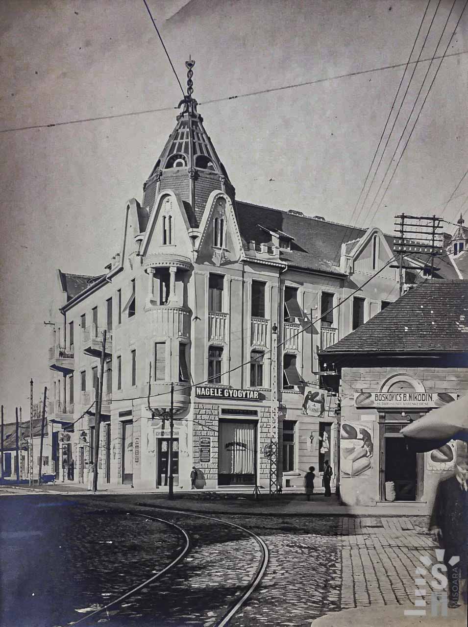 Farmacia a aparținut, succesiv, mai multor farmaciști: Alexander Supp (1891–1893), Eduard Feigl (1893–1894), Ernest Weinrich (1894–1897) și Ignác Neumann (1898–1905). În 1898, clădirea a intrat în proprietatea lui Anton Nägele. La comanda acestuia, arhitectul Henrik Telkes a întocmit proiectul unei clădiri cu două etaje, în stil Secession.