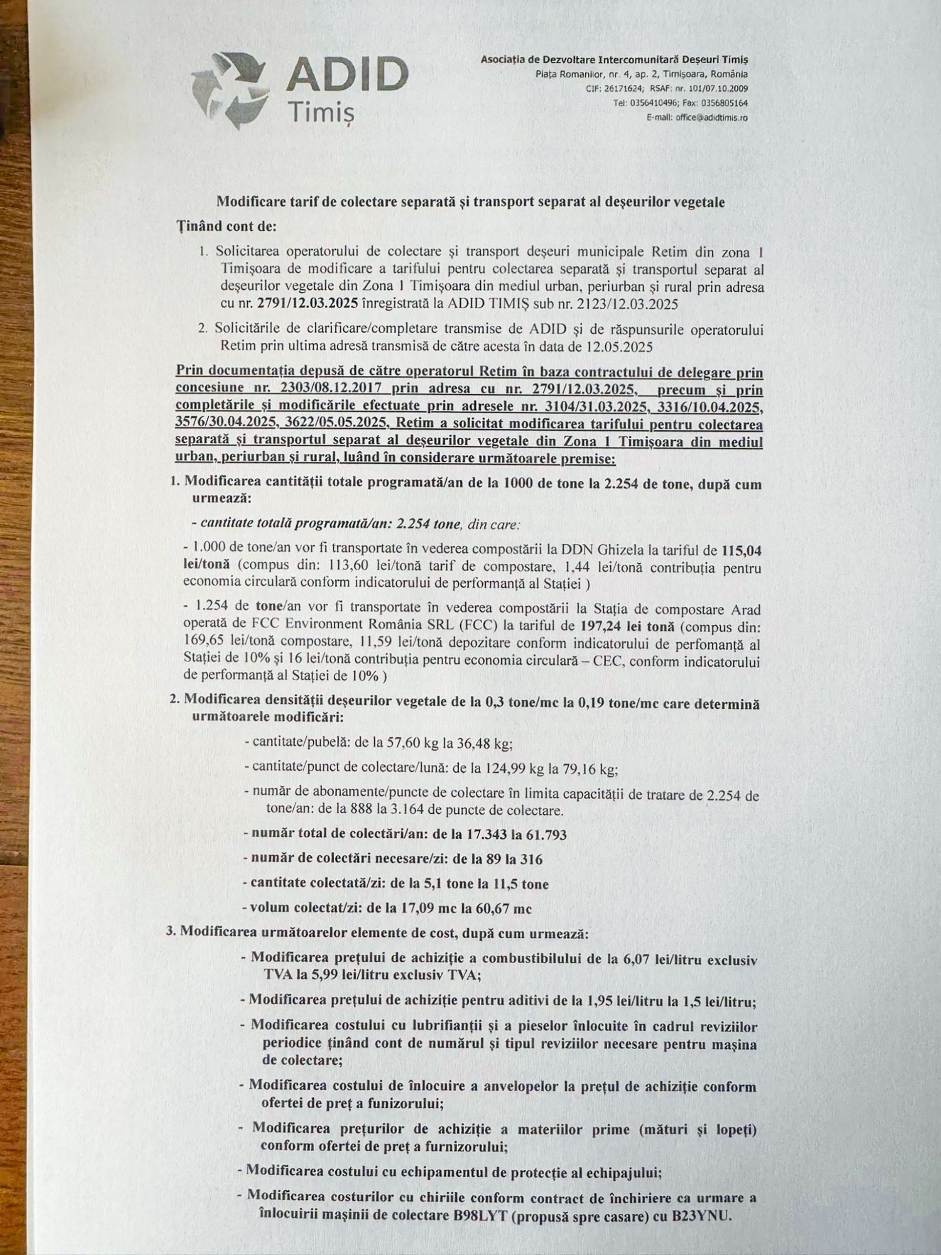 Tariful de colectare a deșeurilor vegetale în Timișoara a fost redus semnificativ, de la 92,06 lei (TVA inclus) la 46,01 lei (TVA inclus). Consilierul local Roxana Iliescu a explicat într-o postare publică principalele motive care au dus la această scădere, punând accent pe demersurile recente ale operatorului RETIM și ale ADID Timiș.