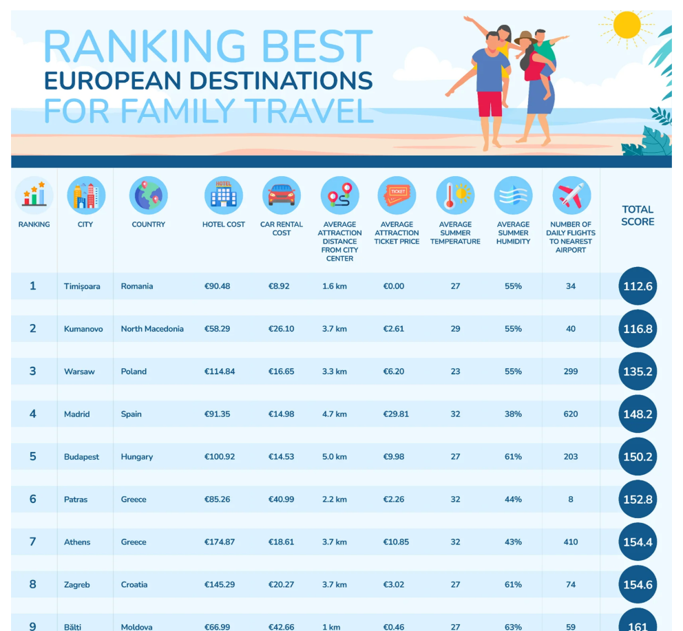 Timișoara ocupă primul loc într-un clasament realizat de DiscoverCars privind cele mai bune destinații europene pentru vacanțele în familie în vara 2025. Studiul a analizat peste 100 de orașe europene, luând în calcul factori precum costurile de cazare, prețul închirierii unei mașini, zborurile disponibile, temperatura medie în lunile estivale și numărul de atracții prietenoase pentru familii.