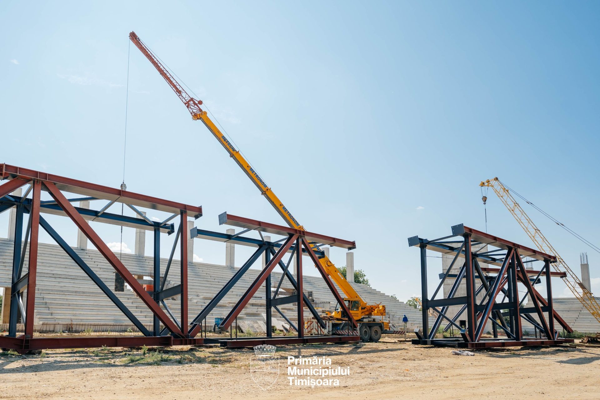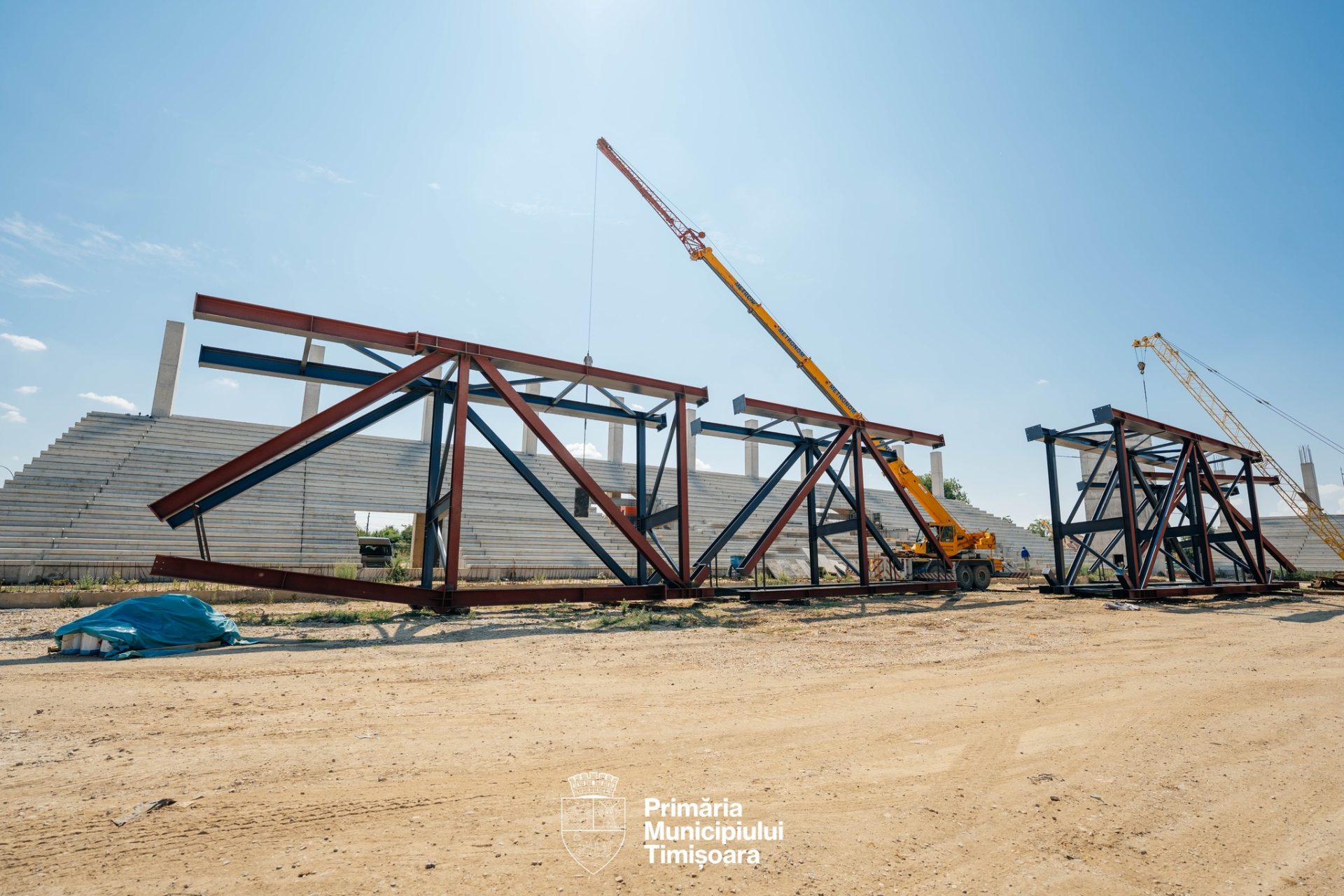 Primăria Timișoara a anunțat că au ajuns primele elemente care vor forma structura metalică a acoperișului stadionului Eroii Timișoarei, care se construiește în Calea Buziașului.