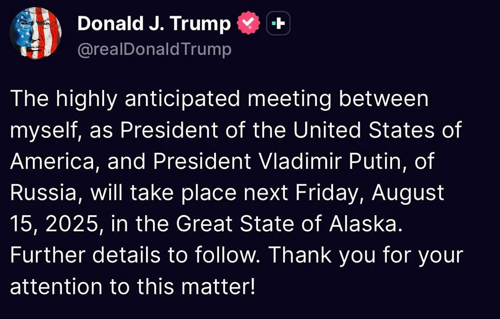 „Întâlnirea mult așteptată dintre mine, în calitate de președinte al Statelor Unite ale Americii, și președintele Vladimir Putin al Rusiei va avea loc vineri, 15 august 2025, în Marele Stat Alaska. Detalii suplimentare vor fi anunțate. Vă mulțumesc pentru atenție!”, a transmis Trump printr-un comunicat oficial pe rețeaua Truth Social.