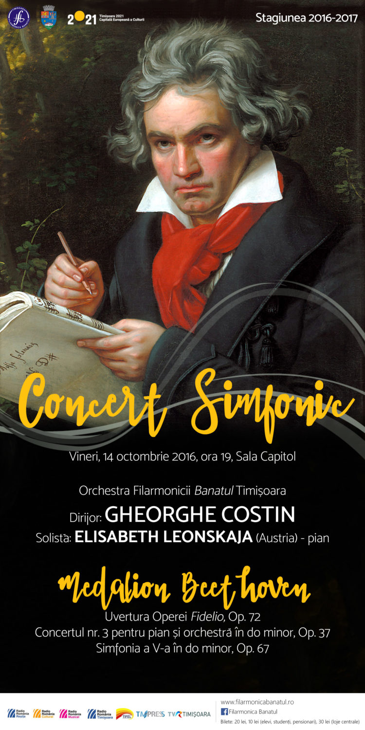 Uriaşa personalitate a lui Ludwig van Beethoven a marcat intrarea muzicii într-o etapă nouă. Fiind la confluenţa a două mari epoci artistice el nu s-a sfiit să încalce canoanele formale ale esteticii clasice, croind drum viguros spre o altă viziune, care avea să îmbogăţească arta muzicală cu noi sentimente, imagini şi forme, vestind începutul marii epoci romantice. Concertul simfonic din 14 octombrie oferă melomanilor trei lucrări caracteristice din marea creaţie a „titanului” muzicii simfonice — Uvertura la opera „Fidelio” op.72, Concertul nr.3 pentru pian şi orchestră în do minor, op.37 şi Simfonia a V-a în do minor op.67.