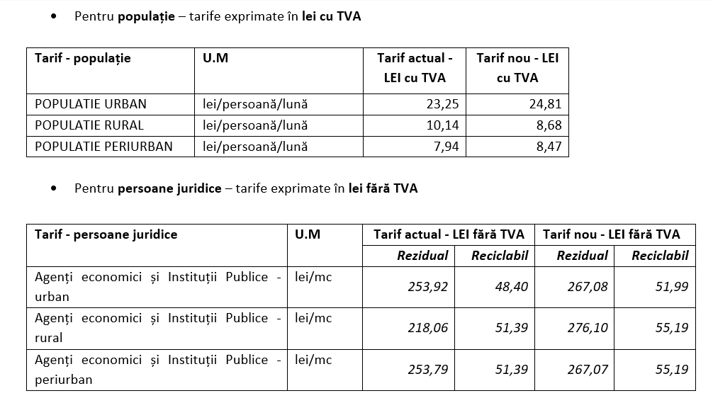 RETIM Ecologic Service S.A. informează toți utilizatorii serviciului de salubrizare (persoane fizice, asociații de proprietari/locatari, persoane juridice și instituții publice) din Zona 1 a județului Timiș că va avea loc o modificare a tarifelor de facturare, ca urmare a stabilirii tarifelor de la instalațiile de tratare și sortare.
