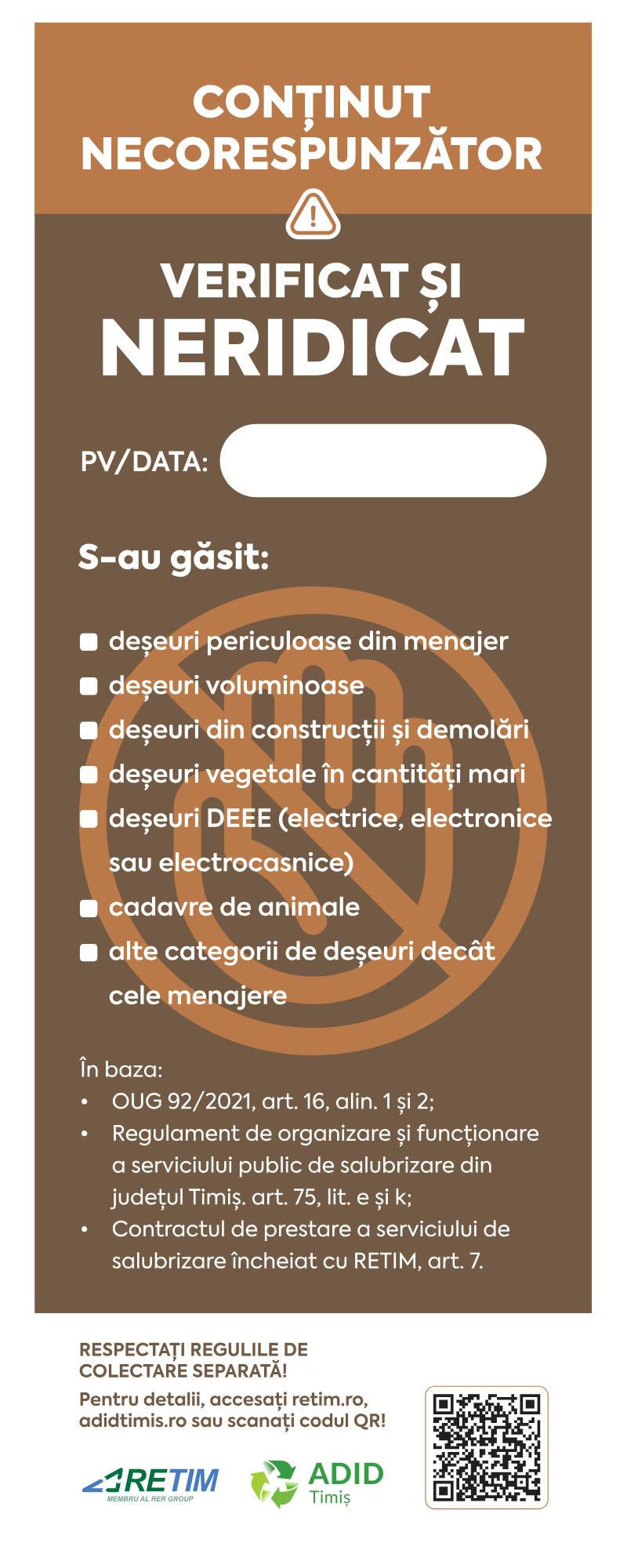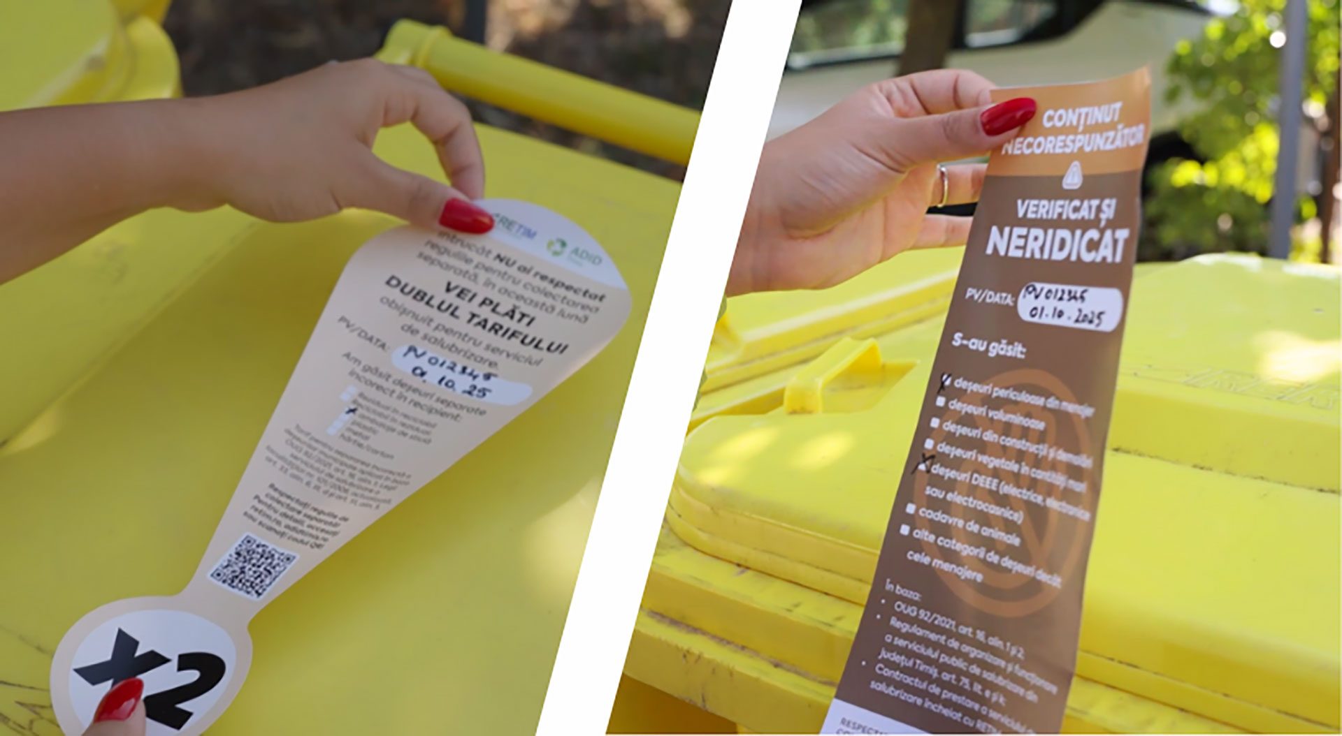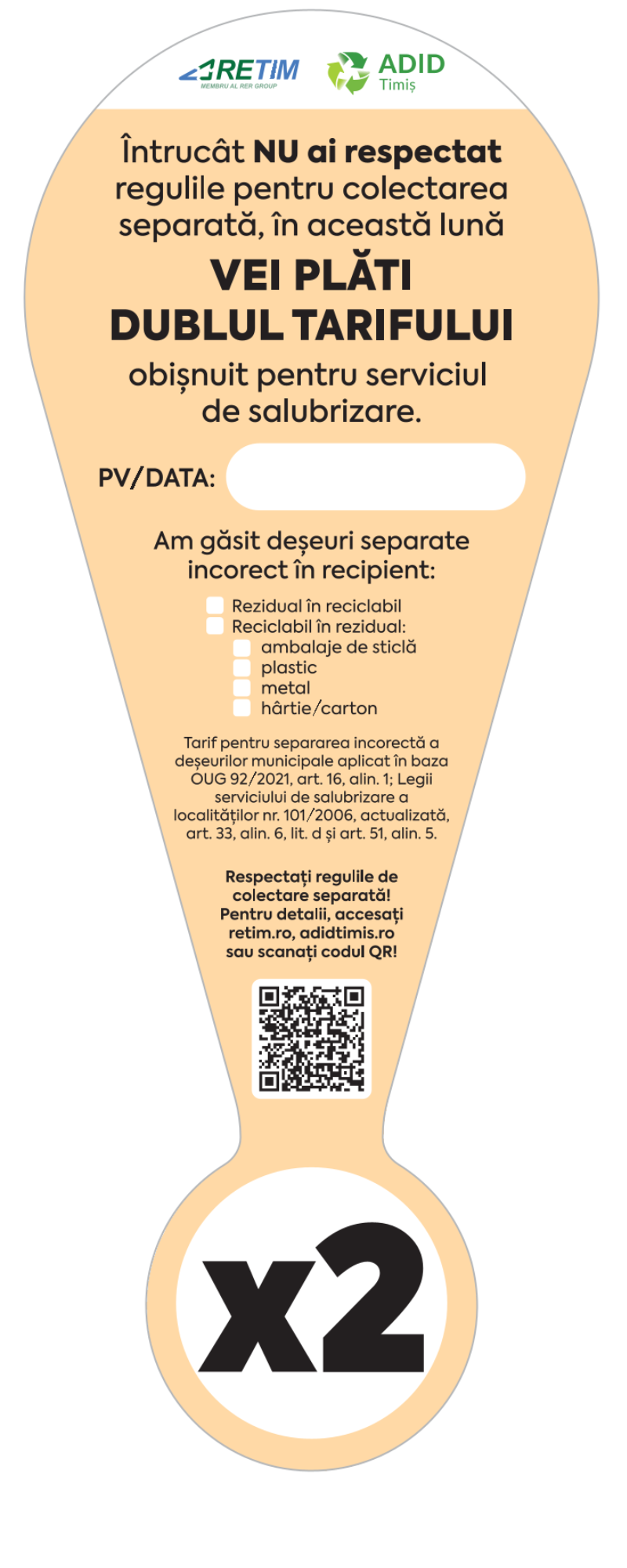 RETIM Ecologic Service S.A. și Asociația de Dezvoltare Intercomunitară Deșeuri Timiș (ADID Timiș) anunță reluarea aplicării etichetelor pentru nerespectarea regulilor de colectare separată începând cu data de 01 octombrie 2025.