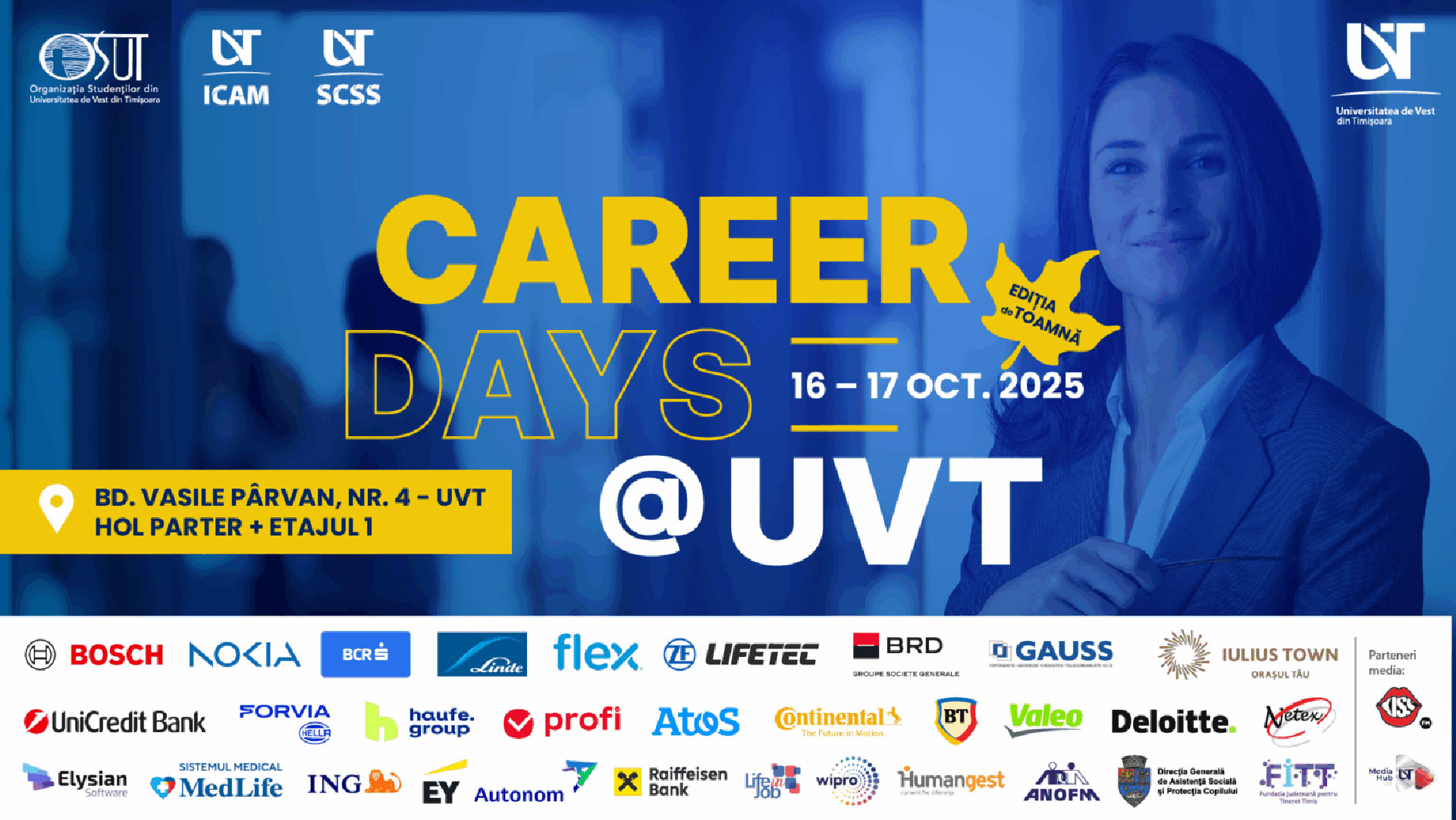 Universitatea de Vest din Timișoara (UVT) transformă campusul universitar în principalul punct de întâlnire dintre viitorii profesioniști și angajatorii din regiune, prin organizarea Career Days @UVT 2025. Evenimentul, dedicat networking-ului și orientării în carieră, se desfășoară în 16 și 17 octombrie 2025, în sediul central UVT de pe Bd. Vasile Pârvan nr. 4.