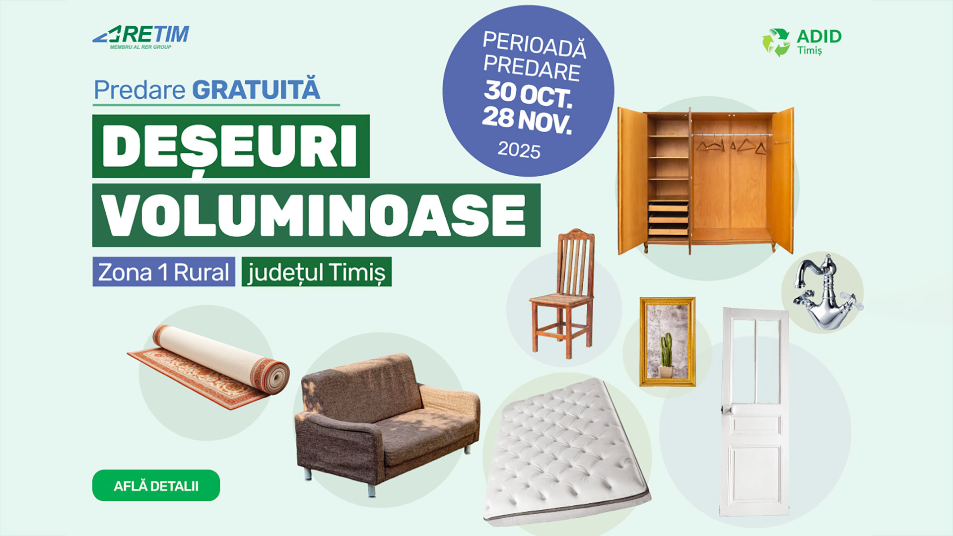 În perioada 30 octombrie – 28 noiembrie, în Zona 1 Rural, Timiș, RETIM Ecologic Service S.A. împreună cu ADID Timiș, organizează ultima campanie de predare gratuită a deșeurilor voluminoase din 2025 în Bucovăț, Parța, Variaș, Sânandrei, Săcălaz (și în Beregsău Mic și Beregsău Mare), Șandra, Iecea Mare, Mașloc (și în Alioș), Pișchia, Fibiș, Cărpiniș, Cenei, Checea, Foeni, Otelec (și în Iohanisfeld), Uivar, Dudeștii Noi, Becicherecu Mic, Satchinez (și în Hodoni și Bărăteaz), Biled, Giulvăz și Peciu Nou (și în Diniaș și Sânmartinul Sârbesc).