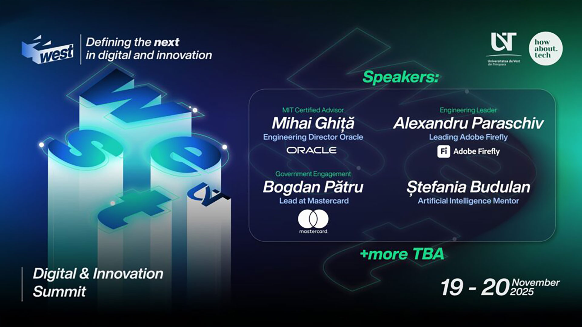 Universitatea de Vest din Timișoara (UVT) se transformă într-un pol al inovației și tehnologiei prin organizarea „West Digital and Innovation Summit” 2025, un eveniment major dedicat viitorului digital, inteligenței artificiale (AI) și transformării tehnologice. Manifestarea, organizată în parteneriat cu „How About Tech”, va avea loc în perioada 19–20 noiembrie 2025, la sediul UVT.