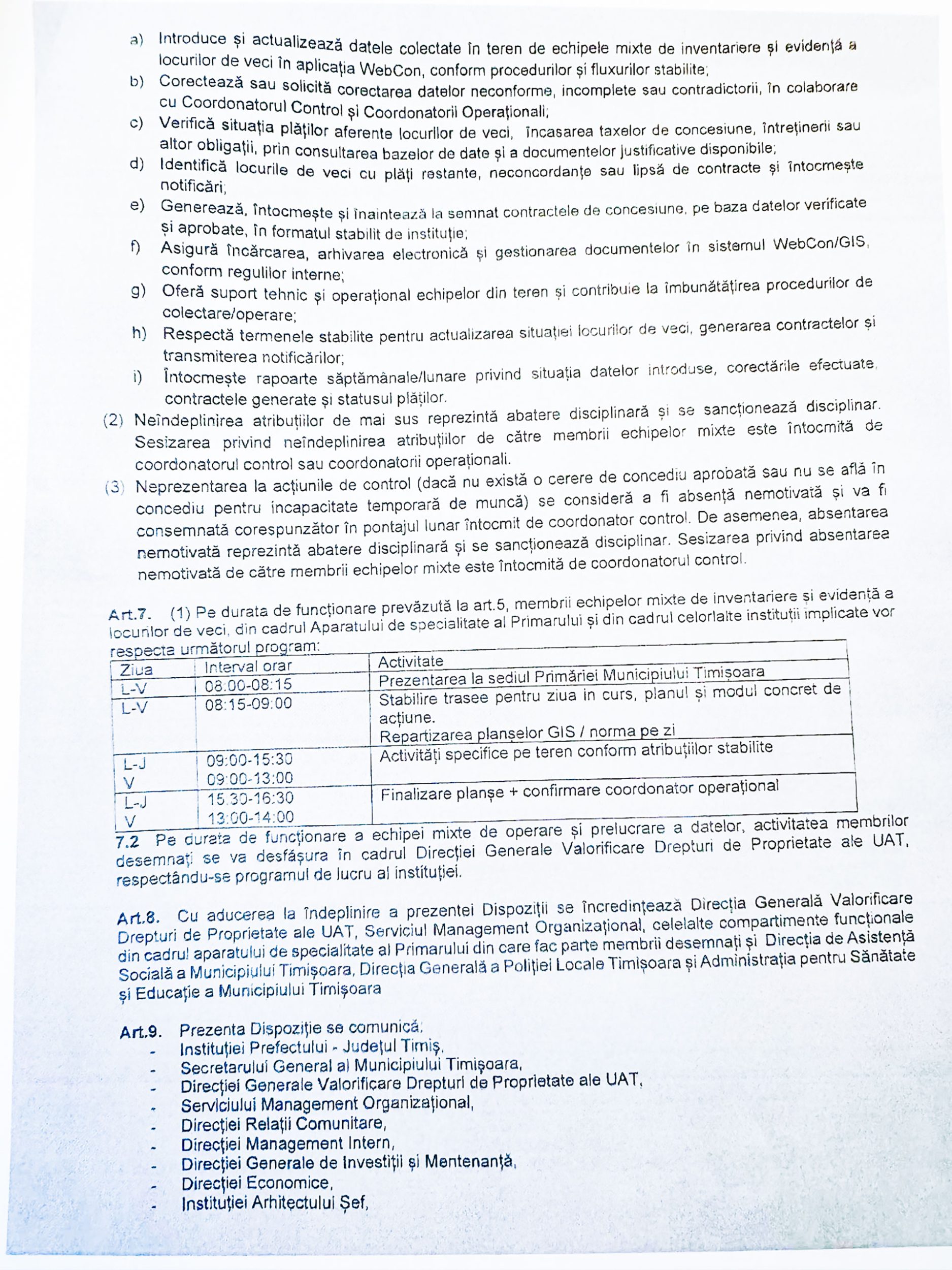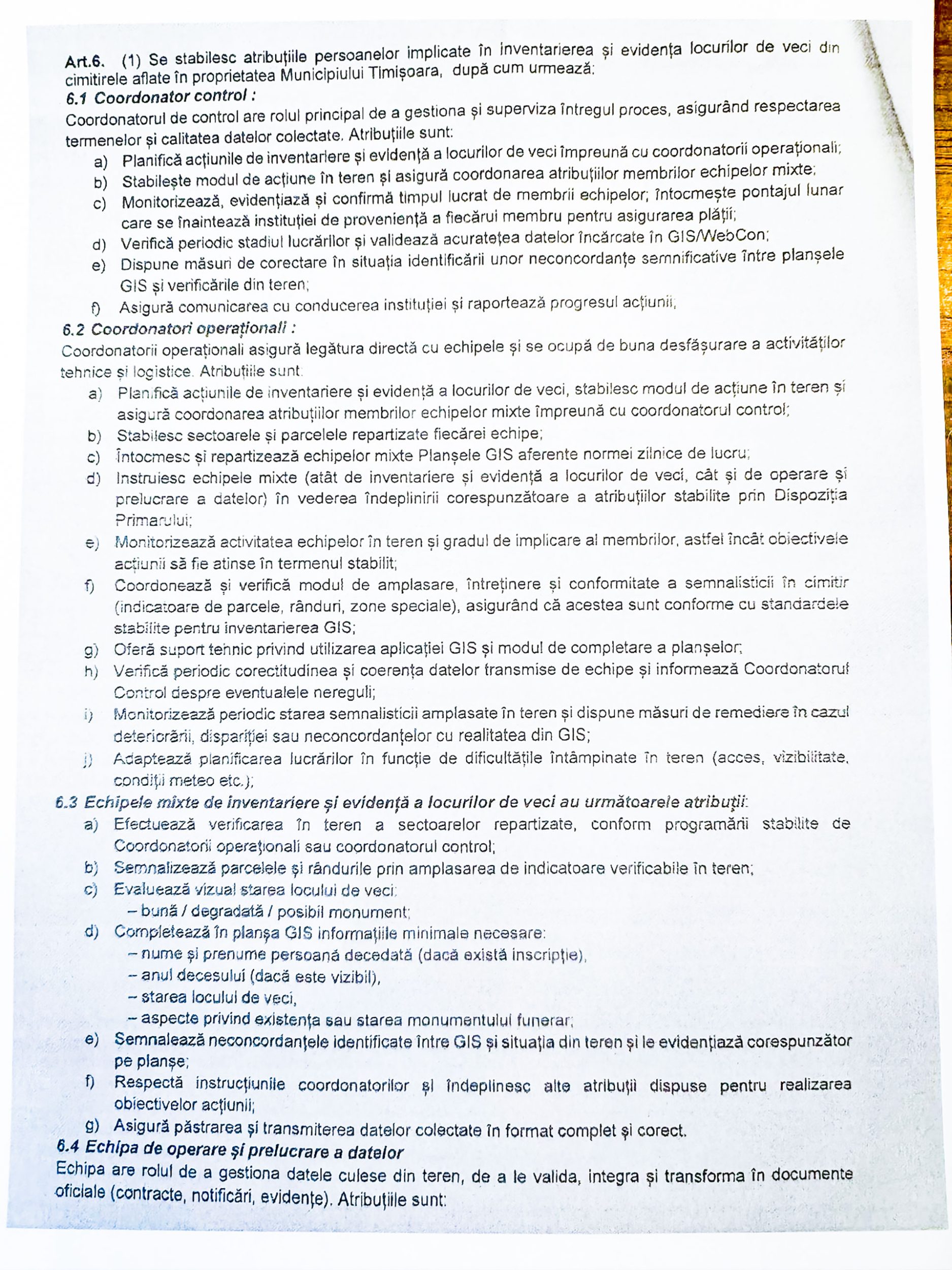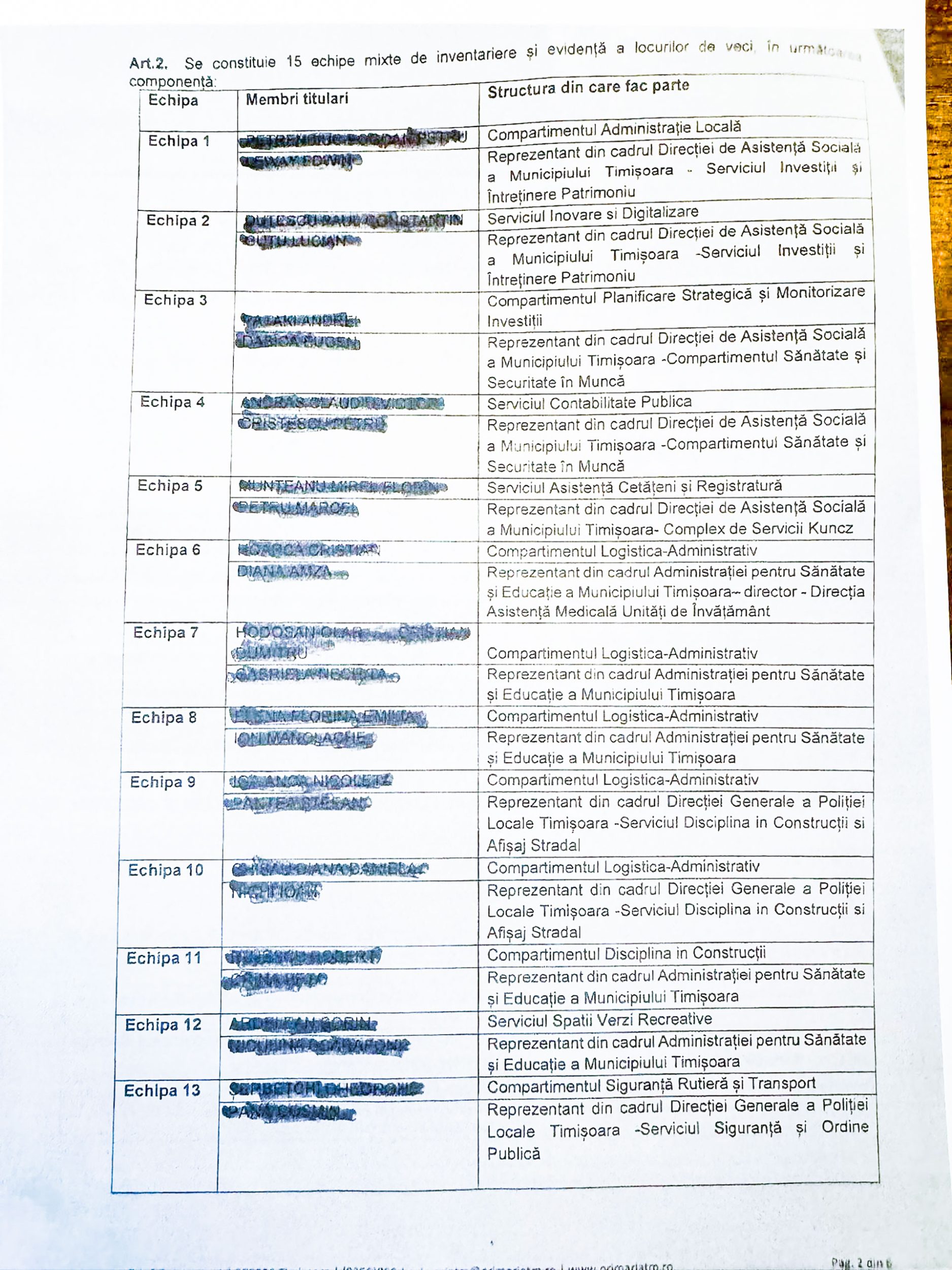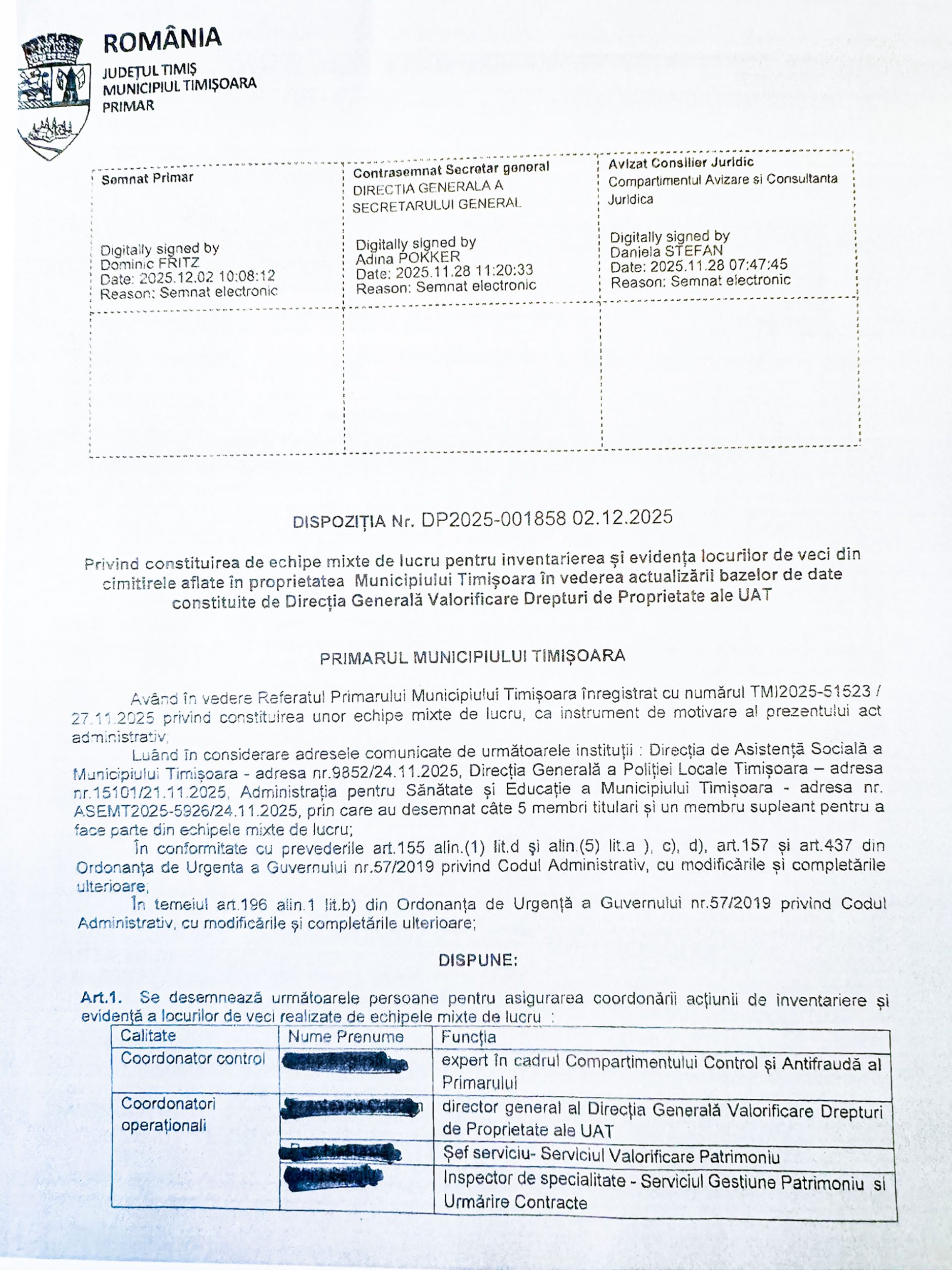 Potrivit declarațiilor acesteia, funcționari din mai multe structuri ale administrației locale – aparatul de specialitate al primarului, Poliția Locală Timișoara, Direcția de Asistență Socială și Administrația pentru Sănătate și Educație – au fost desemnați să participe la această operațiune, deși nu au competențe legale sau profesionale directe în gestionarea cimitirelor.