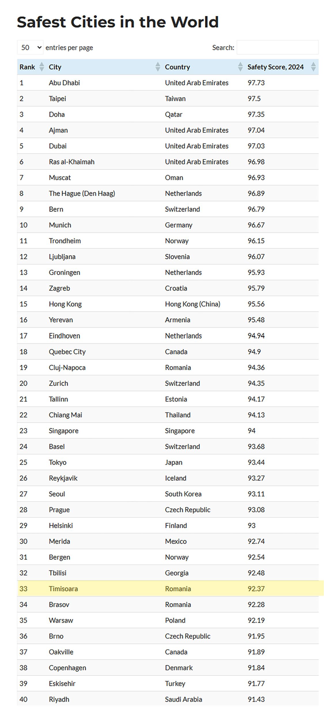 Potrivit unui clasament publicat de revista CEOWORLD, Abu Dhabi a fost desemnat cel mai sigur oraș din lume în anul 2025. Capitala Emiratelor Arabe Unite a ocupat primul loc într-un top care a analizat 300 de orașe la nivel global, obținând un scor general de siguranță de 97,73. Timisoara se regaseste pe pozitia cu numarul 33, avand un index de 92.37. In clasament inaintea Timișoarei se găsește pe locul 19 Cluj-Napoca și pe locul 34 Brașov