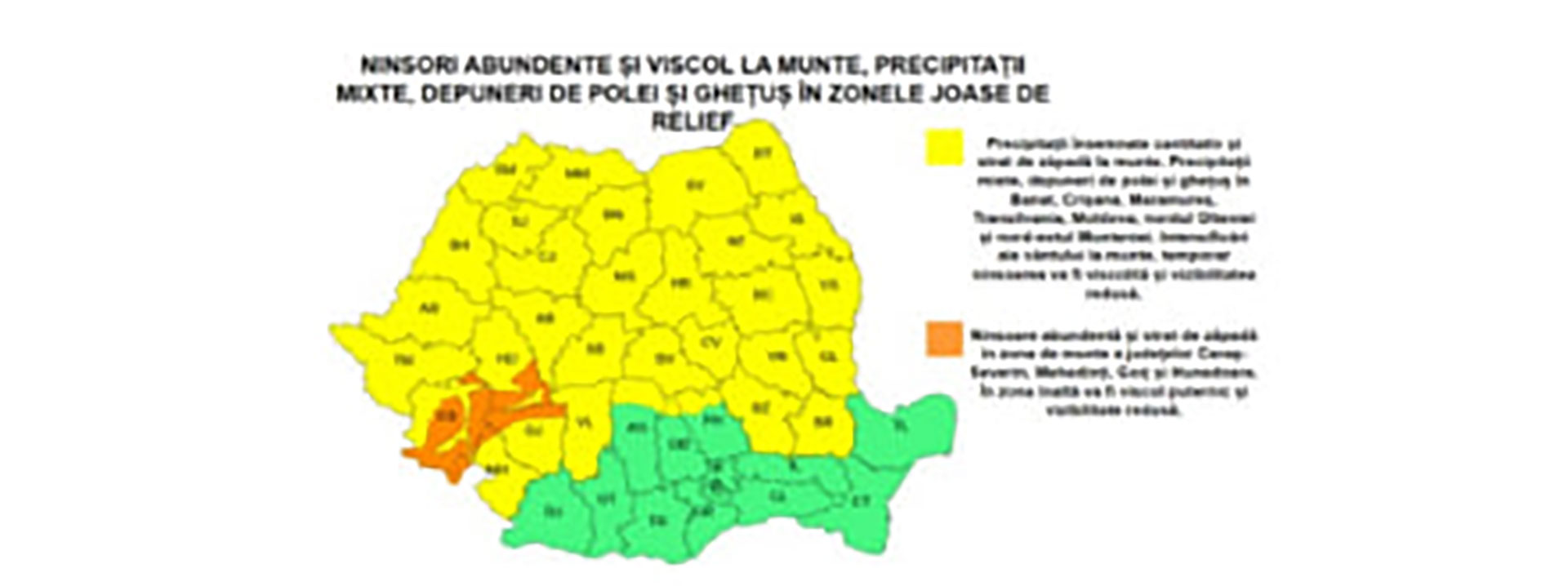 Meteorologii avertizează că, în intervalul menționat, sunt posibile precipitații mixte, depuneri de strat de zăpadă, precum și rafale de vânt care pot reduce vizibilitatea și pot crea dificultăți în trafic, în special pe drumurile județene și naționale.