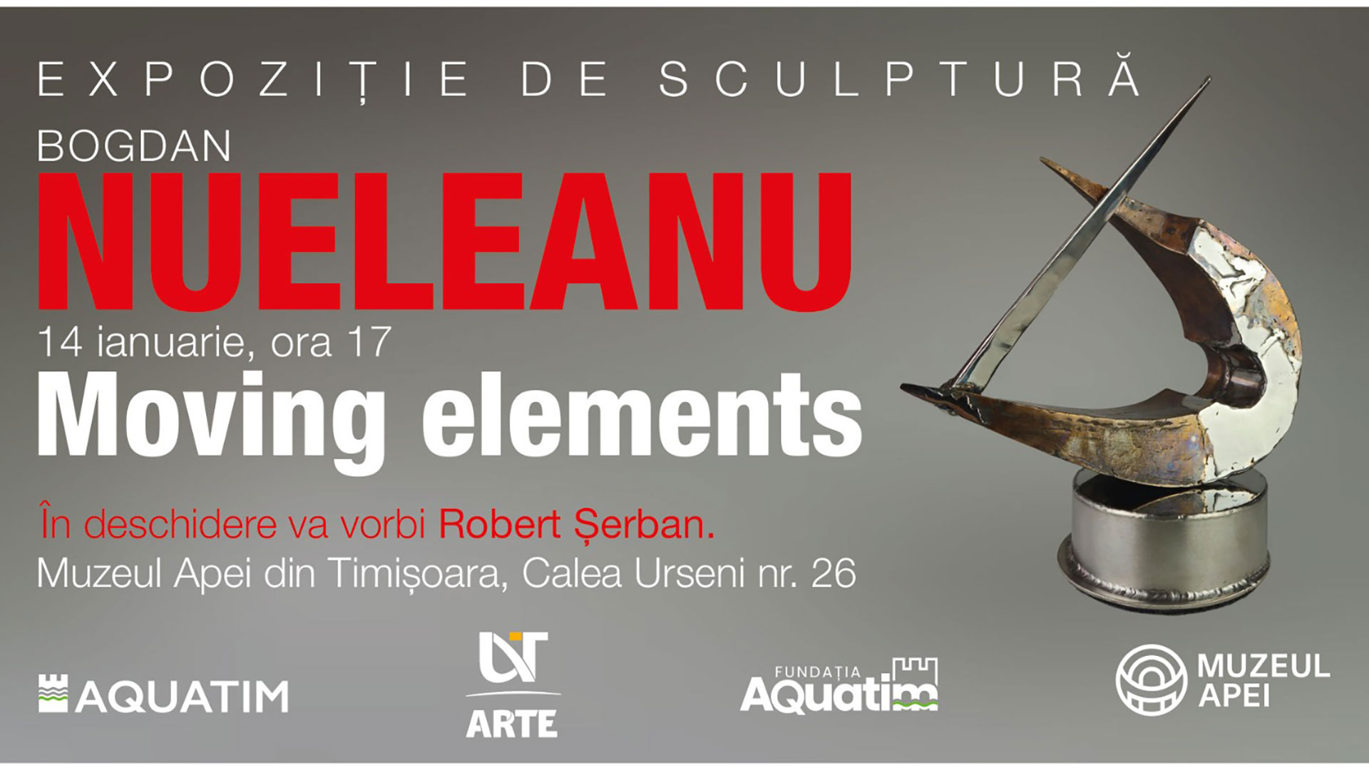 Sezonul expozițional 2026 al Muzeului Apei Timișoara debutează cu expoziția „Moving Elements”, semnată de sculptorul Bogdan Nueleanu, una dintre vocile relevante ale sculpturii contemporane din vestul României. Expoziția este deschisă publicului în perioada 14 ianuarie – 14 februarie 2026 și marchează o nouă etapă în parcursul artistic al autorului, aducând în prim-plan o abordare actualizată a sculpturii sudate.