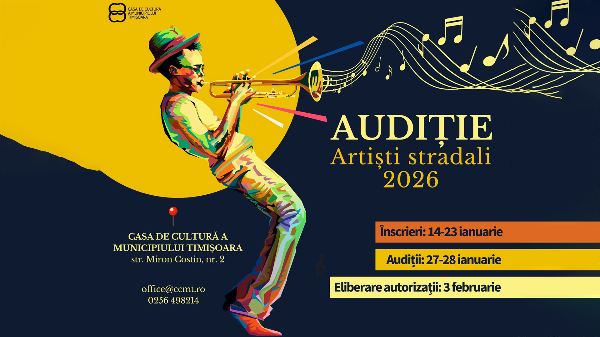 Casa de Cultură a Municipiului Timișoara anunță deschiderea procedurii de autorizare pentru artiștii stradali care doresc să performeze în spațiul public, în conformitate cu Regulamentul privind autorizarea activităților cultural-stradale, aprobat prin HCL nr. 312 din 25 iulie 2023.
