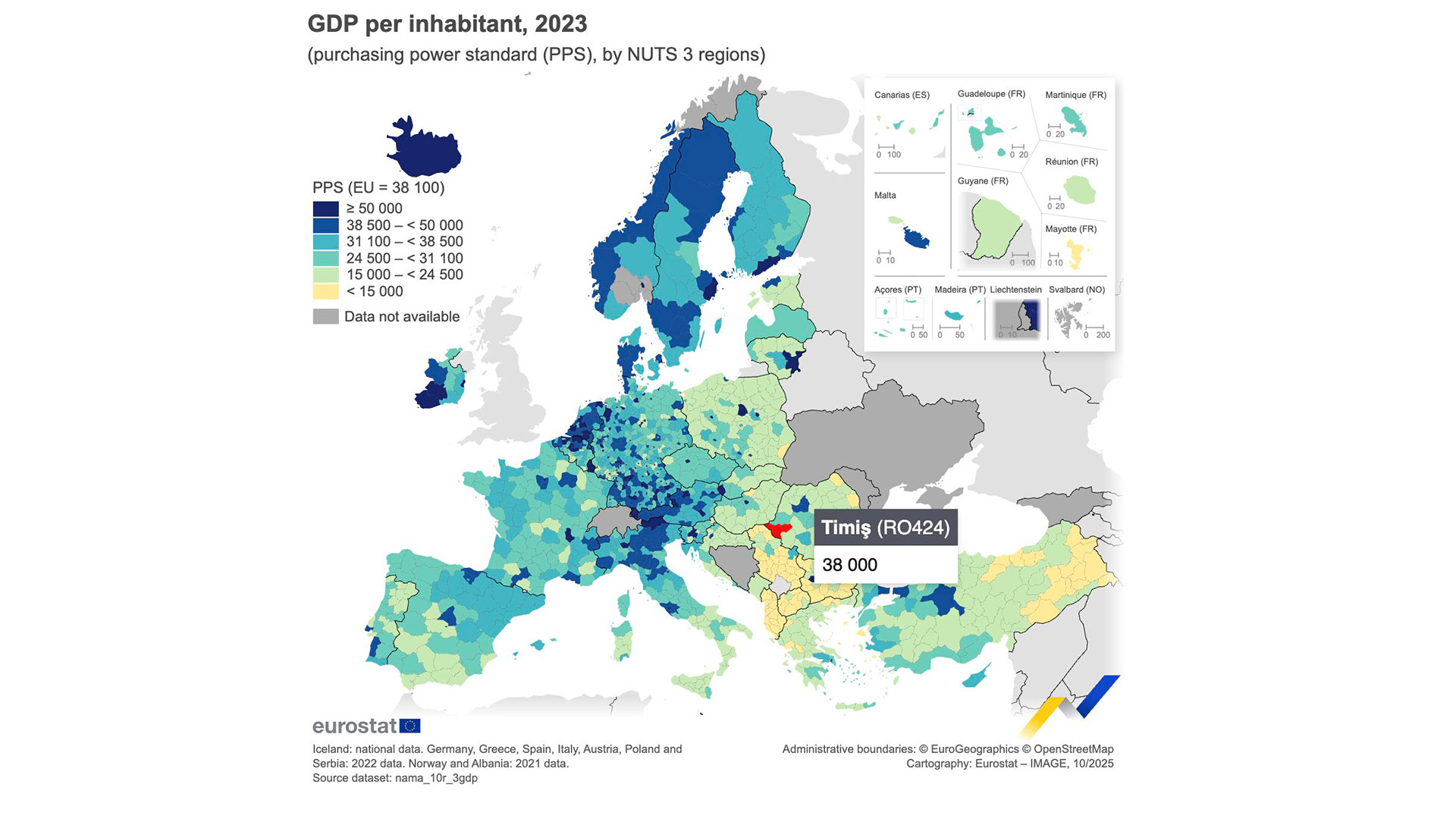Influența economică a orașului depășește granițele administrative și se reflectă la nivel regional. Potrivit datelor publicate de Eurostat, județul Timiș a atins 99,74% din media Uniunii Europene la PIB pe cap de locuitor, raportat la Puterea de Cumpărare (PPS), cu o valoare de aproximativ 38.000 PPS, foarte aproape de media UE, estimată la 38.100 PPS. Indicatorul confirmă o convergență economică aproape completă cu economiile vest-europene.