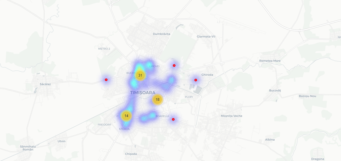 Spre deosebire de alte orașe, distribuția în Timișoara este mai echilibrată, fără o concentrare excesivă într-o singură zonă. Totuși, analiza identifică trei clustere principale: