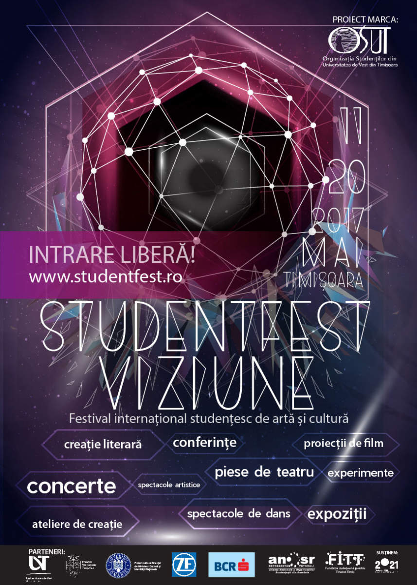 StudentFest, cel mai mare festival studențesc de artă și cultură din România, organizat anual de Organizația Studenților din Universitatea de Vest din Timișoara (OSUT), dă startul unui manifest cultural, joi, 11 mai 2017, de la ora 18:00. Locația deschiderii va fi Aula Magna „Ioan Curea” a Universității de Vest din Timișoara. Încă din prima zi a festivalului vă așteaptă nume ca Byron, Luna Amară, Cuibul, DOMINO, Kindlein, Late November, The Case, Teatrul Studențesc Thespis, Auăleu, Recul și mulți alții.