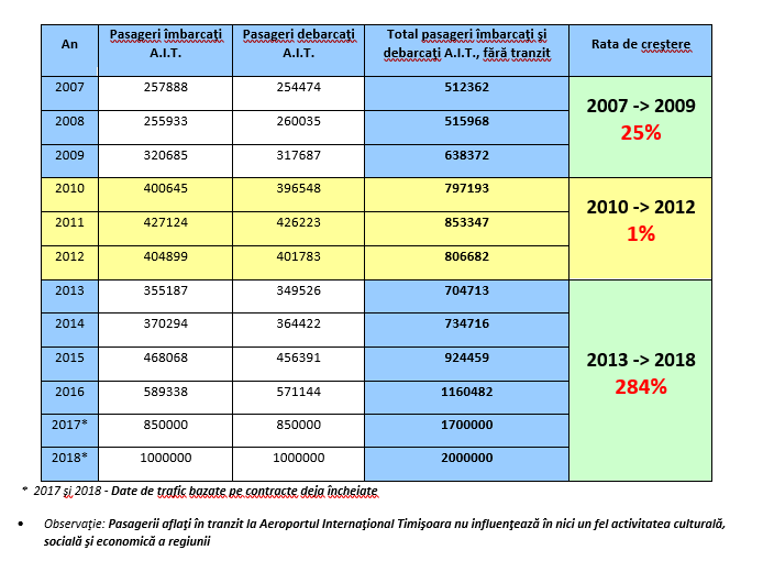 În ultimii 10 ani, Aeroportul Internaţional Timişoara a înregistrat creşteri ale traficului aerian, atât în privinţa numărului de pasageri, al zborurilor, cât şi al traficului de mărfuri. La baza susţinerii acestor afirmații stau datele statistice raportate la Institutul Naţional de Statistică privind numărul pasagerilor îmbarcați/debarcaţi pe Aeroportul Internațional Timișoara începând cu anul 2007 până la ora actuală. Aceste date demonstrează faptul că volumul de pasageri îmbarcați/debarcaţi (fără pasagerii aflaţi în tranzit) de pe A.I.T. va creşte cu 390% în 2018 raportat la 2007. În perioada 2007-2009 traficul de pasageri a înregistrat o creştere de 25%, în timp ce în perioada 2010-2012 traficul pasagerilor a crescut cu doar 1% (perioadă în care actuala echipa managerială nu a activat la aeroport). În ultimii 4 ani, respectiv 2013-2016, trendul ascendent este evident, creşterea numărului de pasageri îmbarcaţi/debarcaţi fiind de 165%. Dacă ne raportăm la estimările statistice realizate având la bază contracte deja încheiate între aeroport şi companii aeriene, în perioada 2013-2018 rata de creştere va fi de 284%. Pentru anul 2018 preconizăm o creştere cu cel puţin 11% față de 2017 (aeroportul atingând 2.000.000 pasageri pe an).În ceea ce priveşte traficul aerian al mărfurilor pe aeroportul din Timişoara, datele statistice pentru perioada 2013-2017 arată o creştere de 281%, iar pentru perioada 2007-2017 vom avea o creştere de 489%.