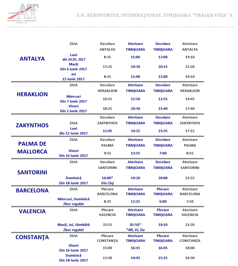 Graficul de operare al curselor auto pentru transfer de la/la aeroportul Timişoara îl găsiţi la agenţii de turism sau pe site-ul www.aerotim.ro . Companiile şi tour-operatorii îşi rezervă dreptul de a aduce modificări programului de zbor.