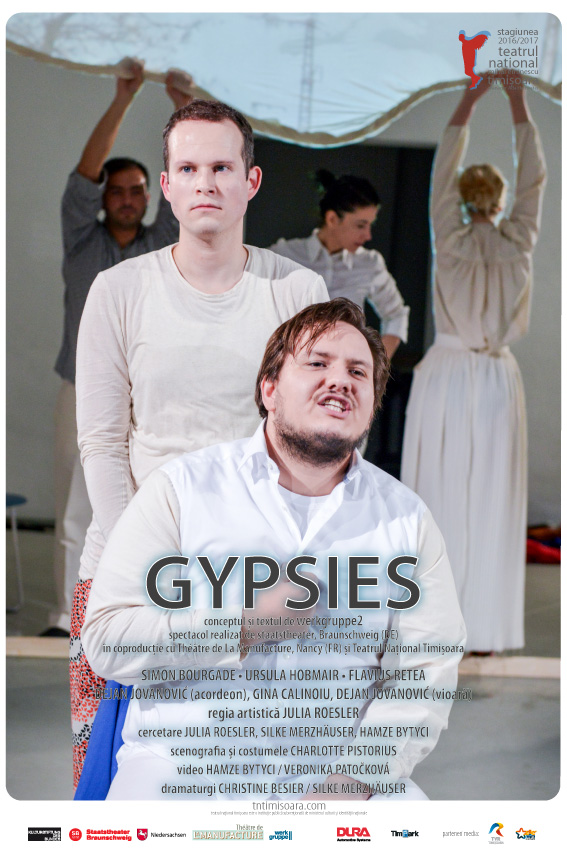 GYPSIES este rezultatul unui proiect de teatru internațional realizat de compania germană de teatru werkgruppe2 în coproducție cu Teatrul Naţional din Timişoara, Staatstheater Braunschweig, şi CDN – Théâtre de la Manufacture din Nancy.
