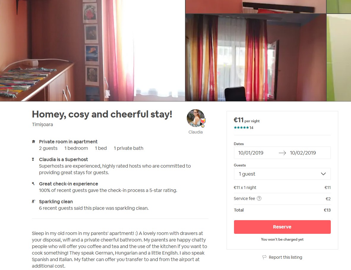 În Timișoara, sistemul de cazare AirBnB a fost îmbrățișat de peste 250 de persoane care au devenit astfel gazde temporare pentru o parte a miilor de vizitatori ai orașului. Apelând la AirBnB poți găsi una din următoarele trei soluții pentru cazare: